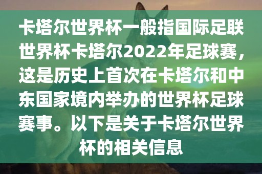 卡塔尔世界杯一般指国际足联世界杯卡塔尔2022年足球赛,这是历史上首次在卡塔尔和中东国家境内举办的世界杯足球赛事。以下是关于卡塔尔世界杯的相关信息