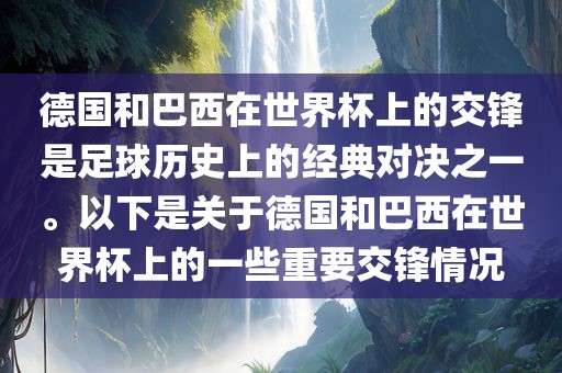 德国和巴西在世界杯上的交锋是足球历史上的经典对决之一。以下是关于德国和巴西在世界杯上的一些重要交锋情况